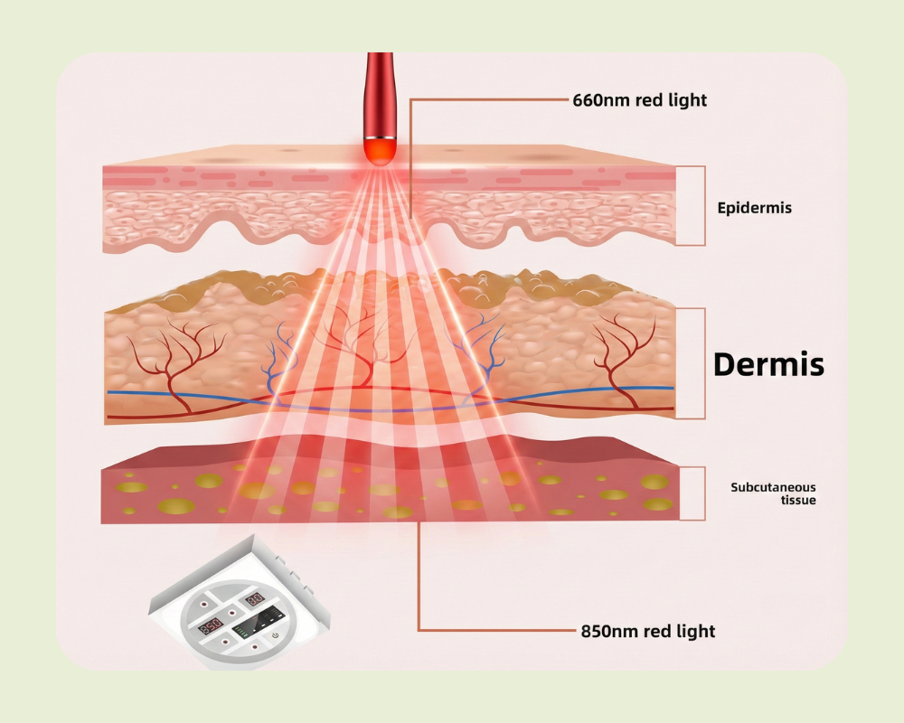 Surface-Level Repair (660nm): The diagram illustrates how 660nm red light is absorbed within the upper skin layers (Epidermis and Dermis), optimizing surface healing and circulation.